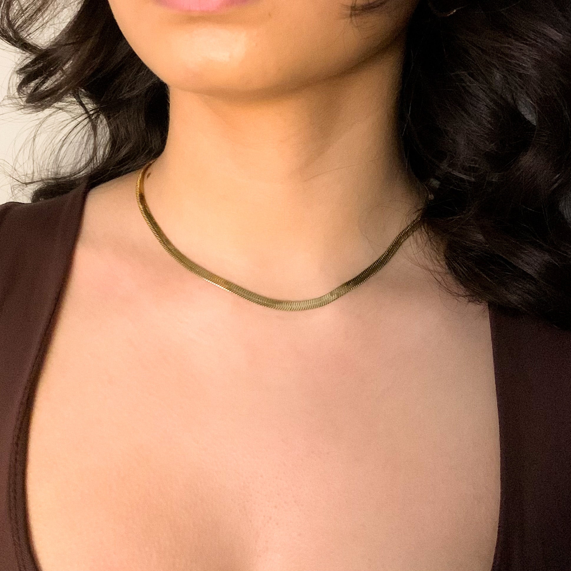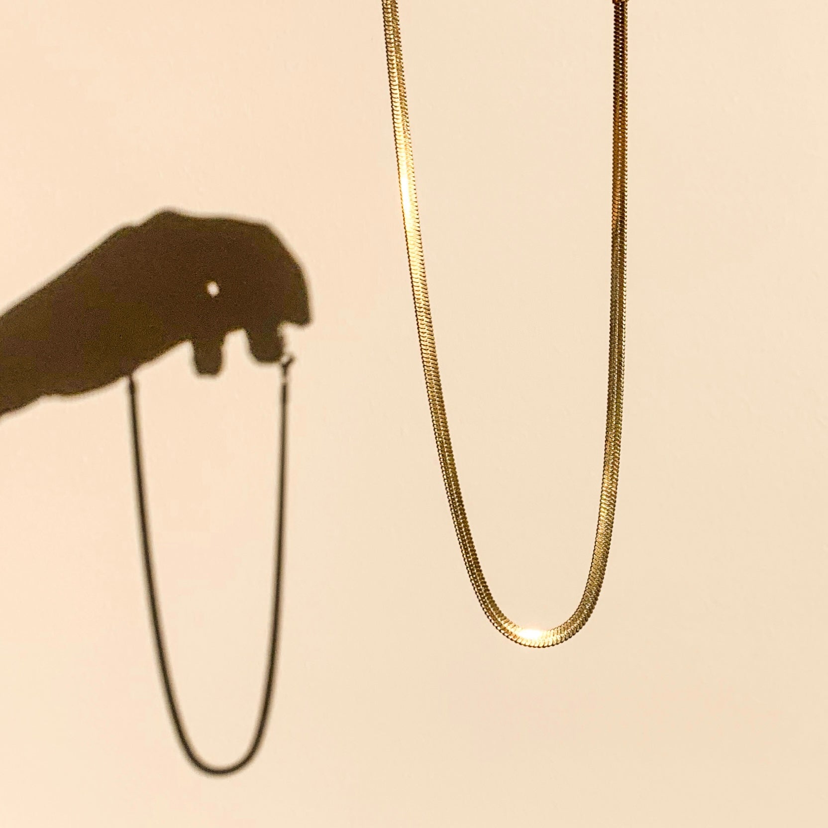 The herringbone snake necklace is a chic & timeless addition to your jewelry collection. Dola, is a sleek herringbone chain that lays effortlessly on your neck like liquid gold. Wear it alone or layer it with other necklaces for an elevated look!